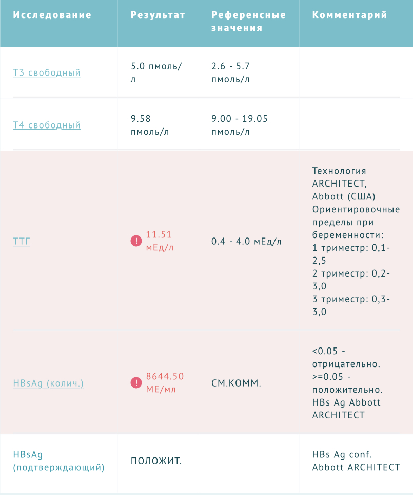 HBsAg: 22.12.14-3920.79, 19.10.15–3244,82, 11.05.16-1179,21; 28.07.16-3.77; 21.10.16 - 1.26, 10.12.16 - 1.26, 17.02.17 - 1.22, 15.05.17 - 1.20