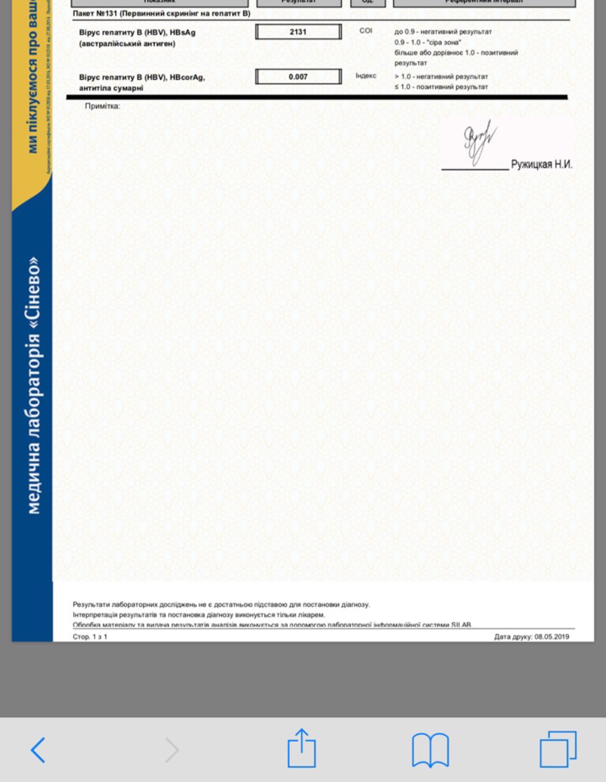 2019: март ДНК 10*2; АЛТ-13; АСТ-17; Билирубин-43/12; ТТГ-1,5; АФП-5; УЗИ БП-гемангиома в печени (1,8×1,3); июнь ВИЧ-отр