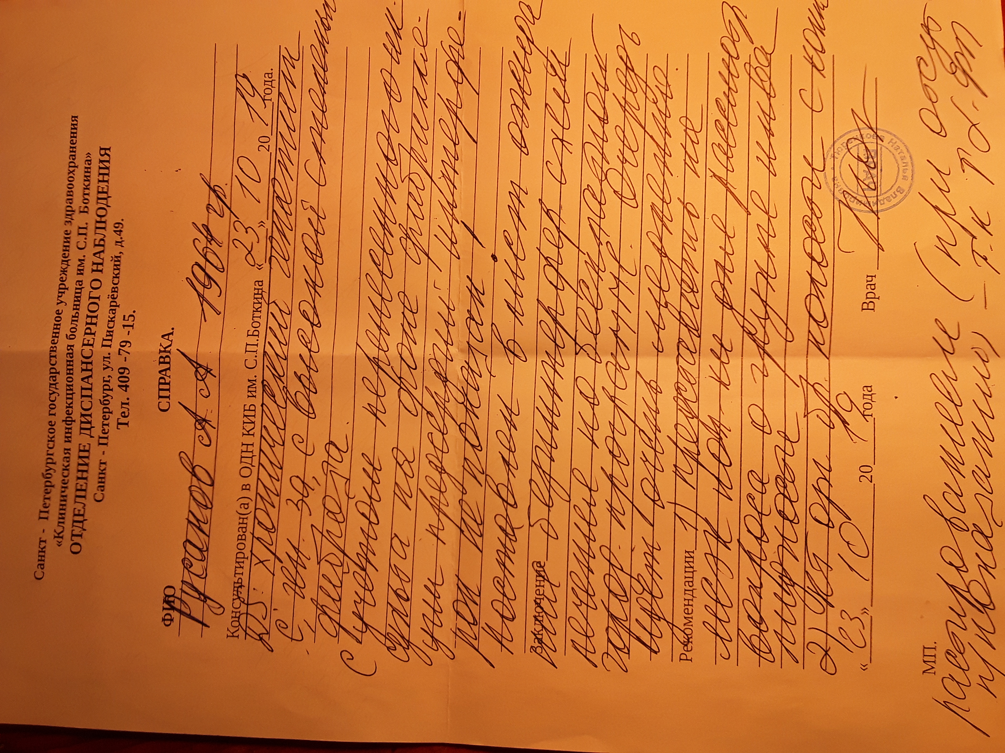 Alena, Я на Миргородской не был. Меня только на Пискарёвке мерили-измеряли. И на инвалидность там направление дали нашему инфекционисту. Я могу сфоткать заключение врача с Боткино последнее, но оно написано от руки. Сфоткать? Я же лох пока в этом.