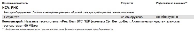 HCV, РНК , чувств 60ме - отрицательно
