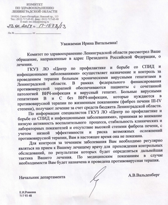 Проходила МО нашл антитела отправили в Боткинскую. я прописана в области. Областные лечатся в НИИ Гриппа (в прошлом году отделение гепатитов переехало в мед. центр им Пастера там же на Петроградке)Так вот без направления там делать нечего в смысле бесплатно ничего не будет. Мне тамошний гепатолог сказал раз я с направлением то лечить будут бесплатно. Но когда он увидел анализы сказал что пока что лечить меня не будут тк есть много людей кому нужнее. Но дал все направление на фиброскан чтоб не переплачивать. Доктор хороший довольно молодой сказал что можно лечиться самой за деньги, сказал как надумаю приходить и все обсудим... Сказал что при моем течении болезни я могу ждать лечения 20-30лет. Назначил фосфоглив и сказал 2р в год приходить на осмотр.