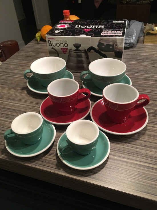 Наконец-то дошли руки купить себе нормальные чашки для эспрессо-напитков от ACME Cups: эспрессо, капучино и латте. Ну чайник с носиком для офисного дриппера...