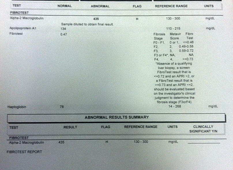 альфа 2 макроглобулин в формулу не вписался - они растворили что ли исходный образец, чтобы посчитать. Ну и фиброз 0-1 получили.