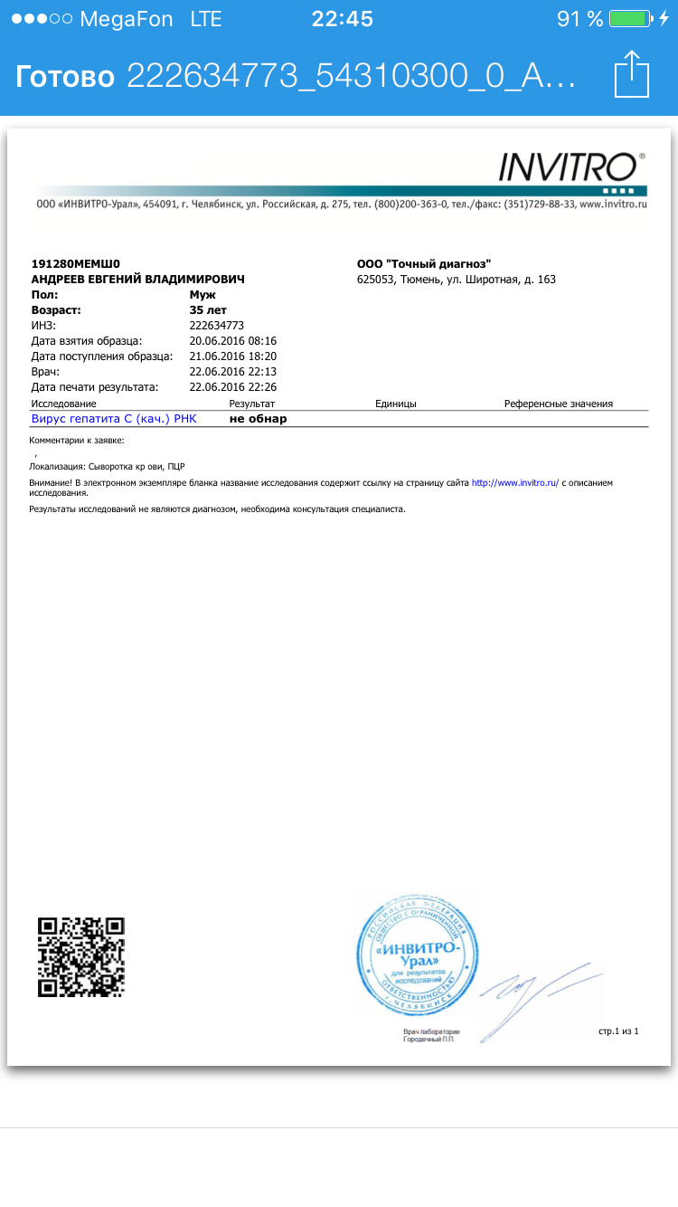 19.10.15 ПЦР кач. 60 ме/мл инвитро - не обнаружено!!!