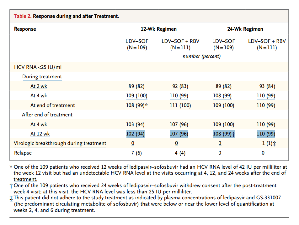да, знаю, что у вас напрашивался бы вывод «продлить и усилить», но как видно, это было бы абсолютно бессмысленным упражнением...1 релапс из 59 человек, у 50% (29 чел) РНК детектировалась в конце последней нед теры и дальше...результат УВО 98% (58/59).Virtuose писал(а):30 из 59 имели в конце ПВТ «цель не обнаружена – target not detected (TND)» или НCV RNA TND <LLOQ и все 30 достигли УВО12. У 29 пациентов в конце ПВТ вирус был обнаружен ниже порога детекции «target detected (TD) или HCV RNA TD <LLOQ. У 3 пациентов из 12 недельной группы вирус продолжал детектировться ниже LLOQ до конца УВО2.