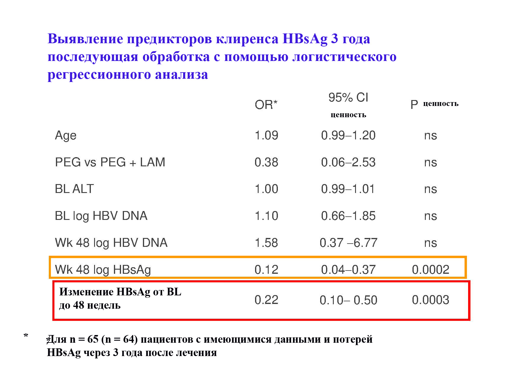 Т.е если идет "быстрый ответ" по снижению HBsAg то надо продолжать как минимум до 48 недель до потери HBsAg, судя по статистическому "логистическому регрессионному анализу"))