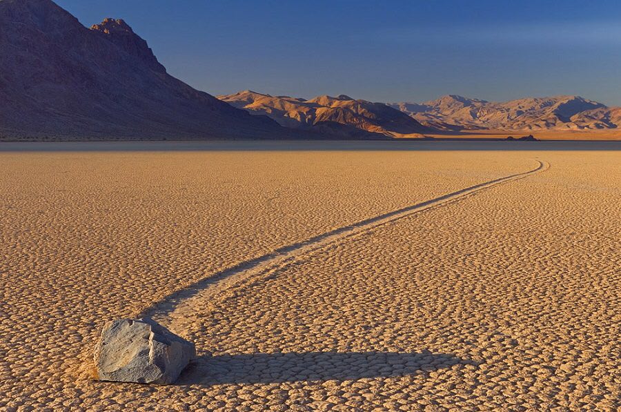 Долина блуждающих камней - геологический феномен, обнаруженный на дне древнего высохшего озера Рейстрэк-Плайя, США. По глиняной поверхности равнины медленно двигаются камни, оставляя длинные следы.
