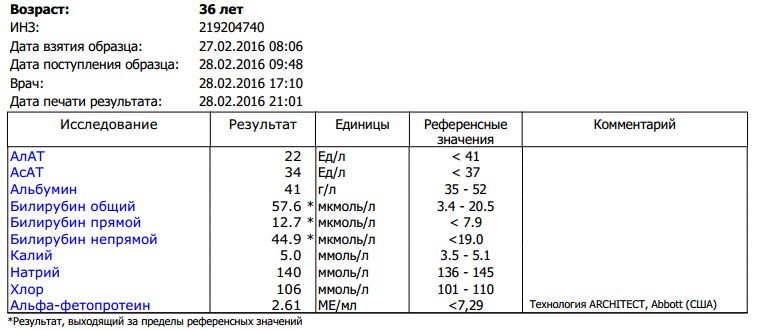 HBeAg - ; anti-HBe + ; anti-HDV total - ; anti-HCV total -