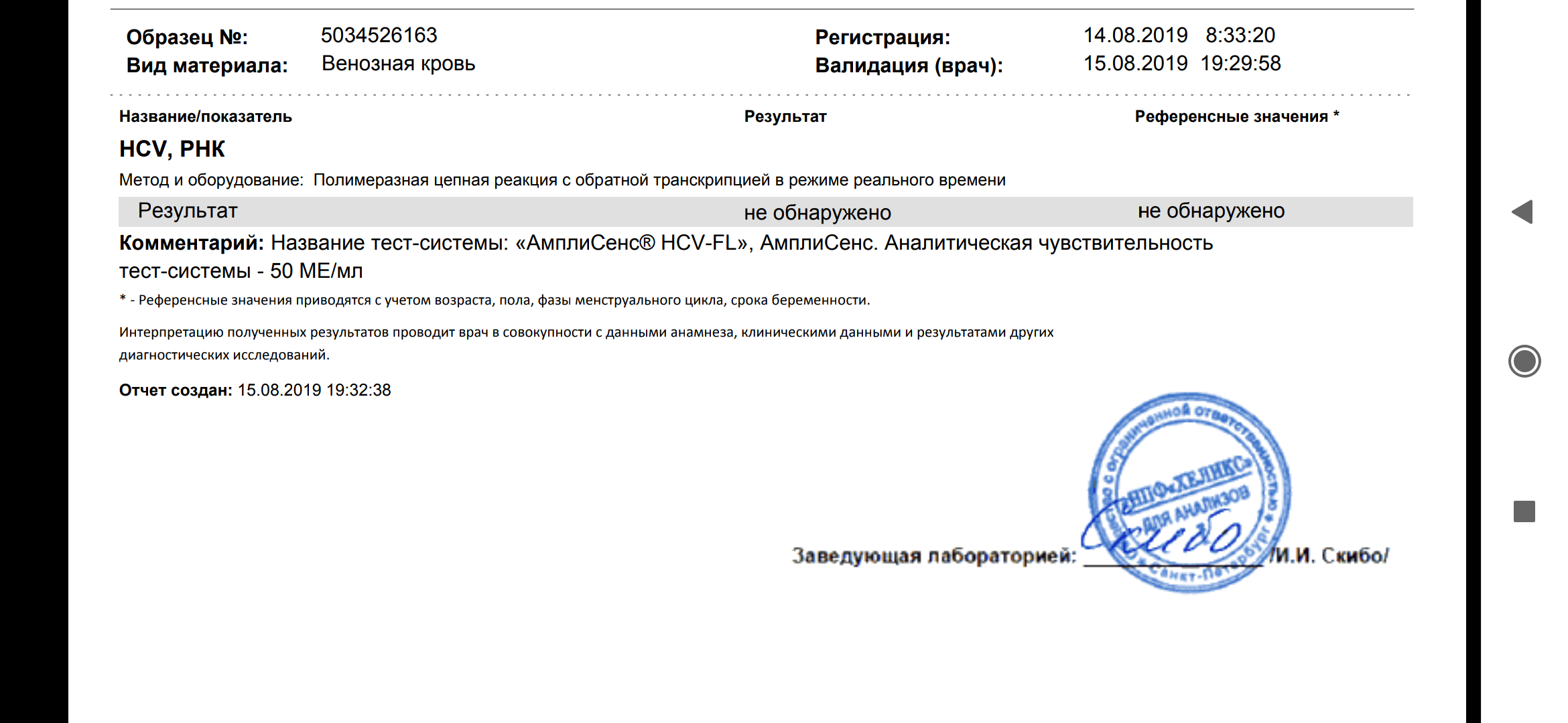 ПЦР 4 нед (-) не обнаружено (чуств. 15 МЕ/мл)