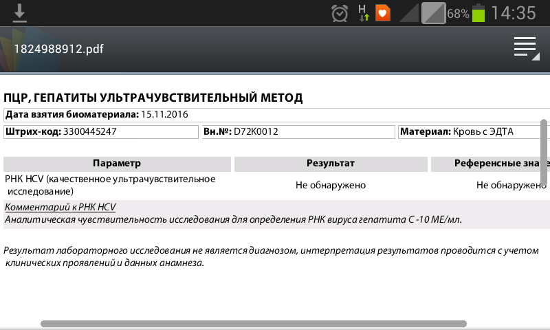 2 н: АСТ 23.30 АЛТ 27.50 ПЦР количественный 150 МЕ/мл < 150 МЕ/мл (ИДЦ)