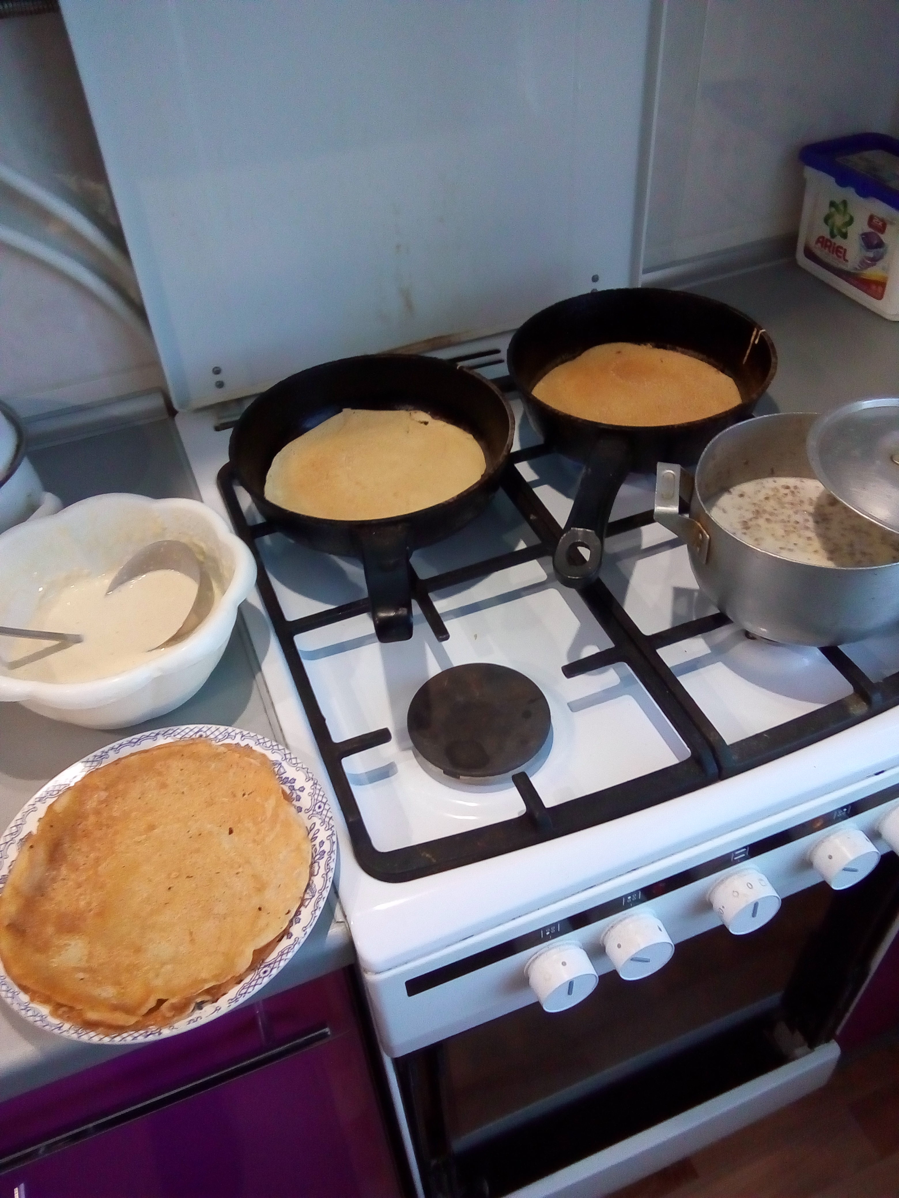 Я тоже завтрак приготовил.БЛИНЧИКИ!И ГРЕЧА С МОЛОКОМ.Кому что?
