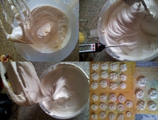 Слева направо и сверху вниз необходимые приблуды для изготовления зефира - ёмкость для взбивания, миксер (желательно не такой древний ручной как у меня, а стационарный ватт на 900), кастрюля с антипригарным покрытием для варки сиропа, силиконовая ложка (можно деревянную), кулинарный термометр (можно без него), три кондитерских мешка, на них тёрочка для цедры, кондитерский гвоздь для роз на квадратиках бумаги для выпечки, три насадки на кондитерские мешки (для роз, для цветка, для рифленых завитков). Всё это стоит на подложках для отсаживания зефирок (у меня это старые пластиковые подставки под тарелки).