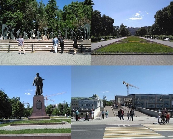 Напротив памятника на бульваре скульптурная композиция с фонтаном Клоуны. Там много компонентов - сам фонтан с клоуном с зонтиком, из чемодана которого вываливается еще один клоун; клоуны, играющие в чехарду; клоун кувыркающийся; клоун сидящий на корточках; клоунский реквизит. Площадка довольно большая, и все в кадр не помещалось.