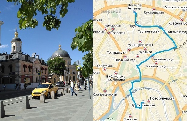 Поворачиваем налево и выходим на Трубную площадь и Рождественский бульвар. С правой стороны бульвара виднеются одна за другой колокольни Церкви Евгения Херсонского, собора Рождества Пресвятой Богородицы, церкви Иконы Божией Матери Казанской, все они находятся на территории Богородице-Рождественского ставропигиального женского монастыря. В конце бульвара виднеются золотые луковки храма Новомучеников и Исповедников российских на Крови. На самом бульваре в его начале стоит Центральный рынок.