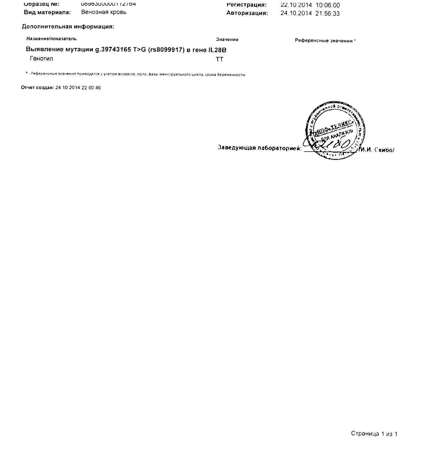 Т/Т - Полиморфизм в гене IL28B: rs809991 не выявлен. Возможно спонтанное разрешение инфекции. Около 70% пациентов с ХГС отвечают на лечение.