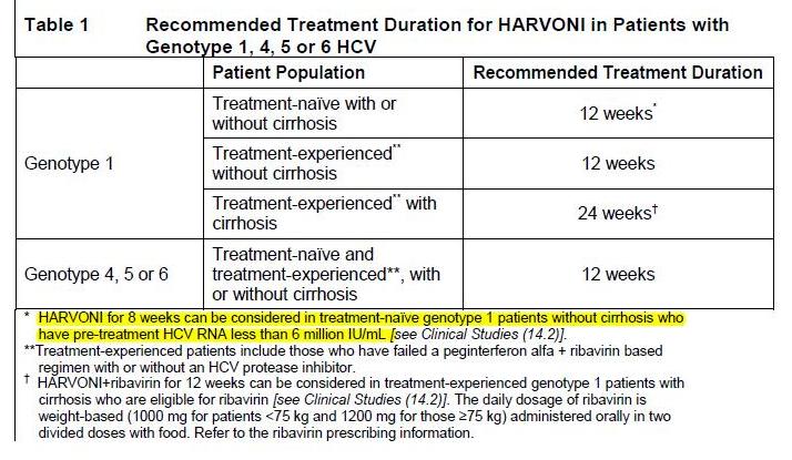 друзья! прошу вас не ругать меня, но Я это взял из информации по применению Harvoni! а тут про фиброз ни слова... для наивных как с циррозом так и без -12 недель, но пишут, что если кол-во менее 6^10*6 то можно и 8 недель....