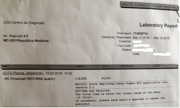 После вчерашнего извещения от ГермДиагнЦентра, что у меня после двухнедельного потребления таблеток уровень вирусной нагрузки ниже "чуйки" в 15 МЕ ( < 0.010 кМЕ ) , хожу окрылённый. Правда эти результаты никак не "бьют" с результатами от Invitro. Но немцам я доверяю больше, с учётом того, что измеряли нагрузку в Германии.