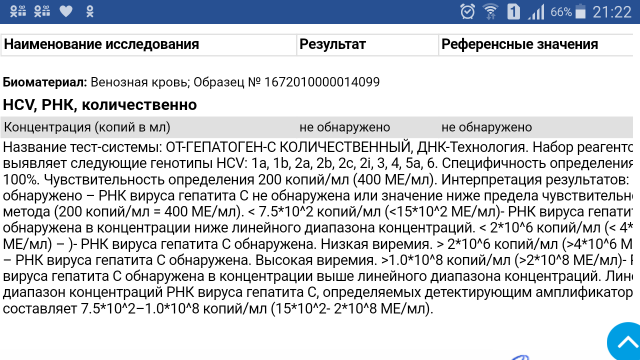 определяемый фрагмент – специфический участок РНК вируса гепатита С; специфичность определения - 100%. Выявляемые генотипы: 1а, 1b, 2a, 2b, 2c, 2i, 3, 4, 5a, 6 независимо от субтипа. Чувствительность определения - 60 МЕ/мл Линейный диапазон: 10^2 - 1х10^8 МЕ/мл."
