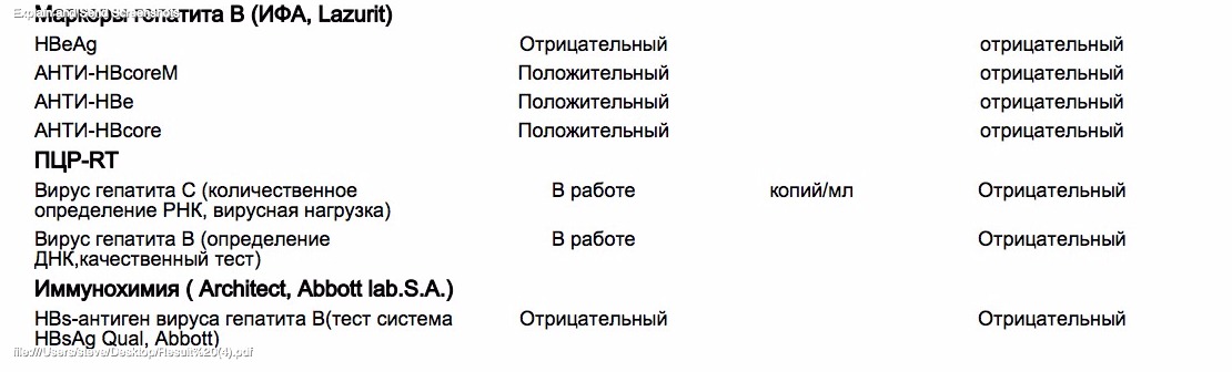 HbsAg +, HbeAg -, AntiHbe +, ПЦР (кач/колич) -/-, биохимия норма