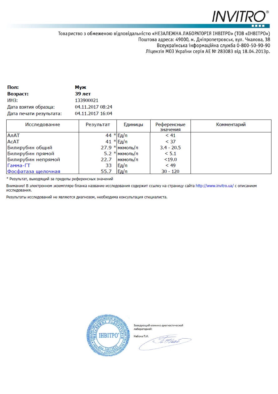 Билирубин начал приходить в норму, понизился по сравнению с анализом от 04.11.2017.