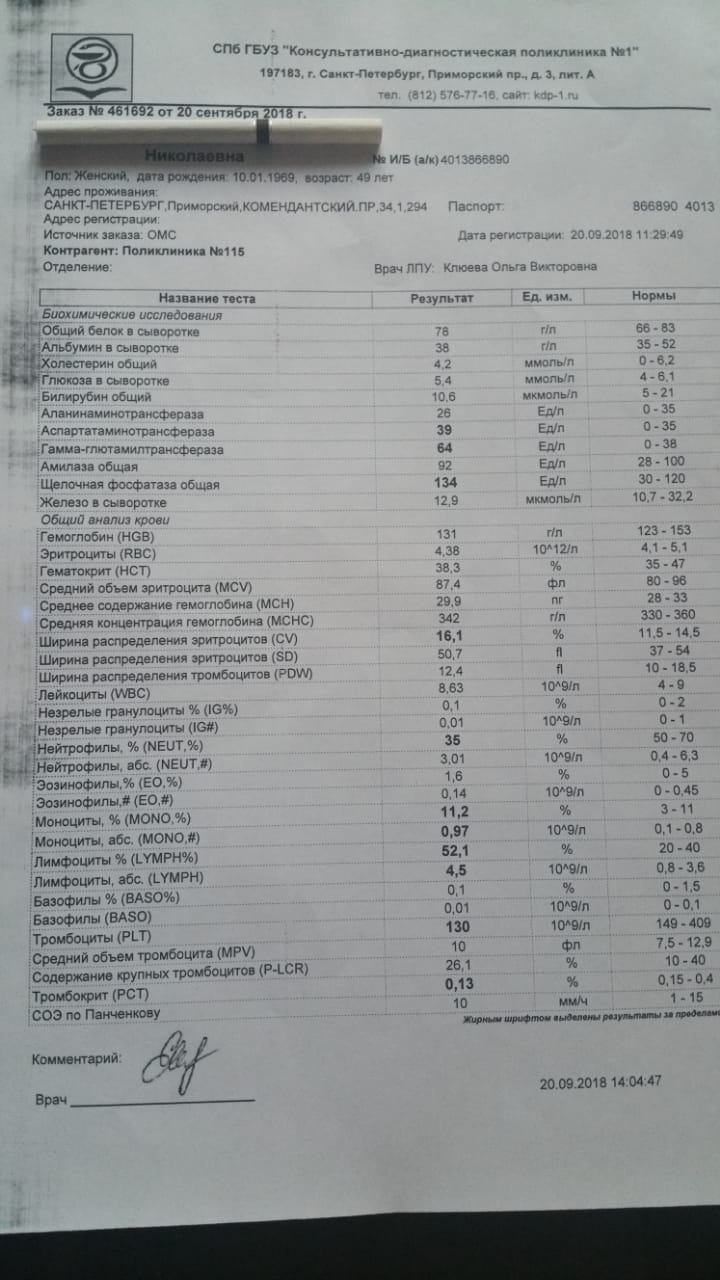 результат ФС 18.09 на 2й день после финиша ПВТ. делала впервые. все анализы от 20.09 : ГГТ 64, фосфатаза 134, АСТ 39. остальное норм. тромбоциты подросли до 130) УЗИ - воротная 1.0 селезеночная 0.6 свободной жидкости в бр. полости нет. все майские показатели в активной фазе до ПВТ завалены. плюс общее состояние. за время лечения практически вся симптоматика ушла, и только эти 74,2 кПа портят мне настроение. ФГДС будет 10.10.