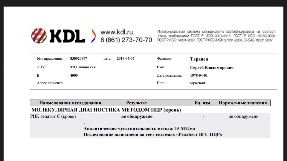 Исследование выполнено на тест-системах «РеалБест ВГС ПЦР»