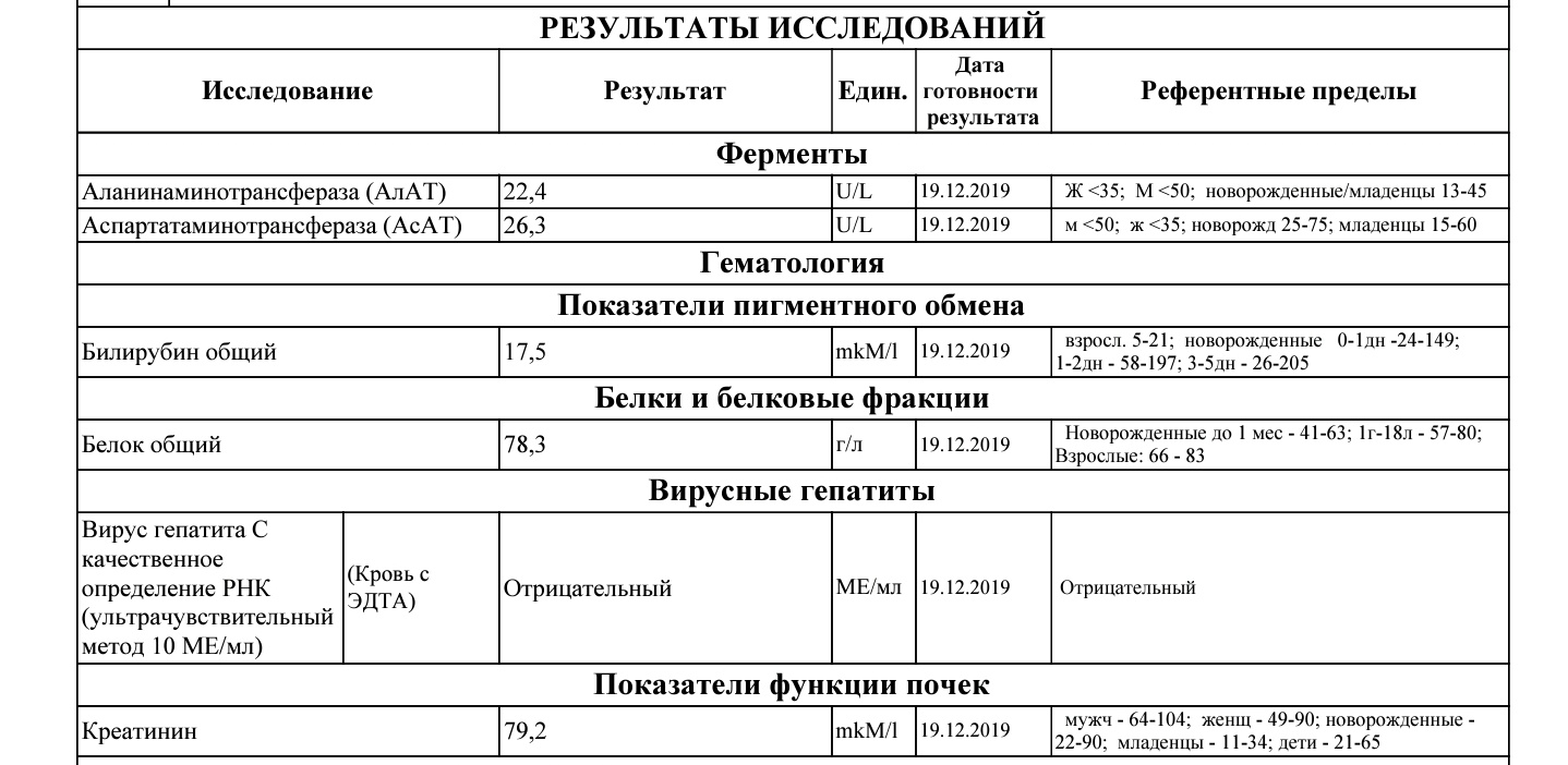 26.12.18 г. 4 нед. ПЦР кач. "-" 15 ме, АСТ-23, АЛТ-19