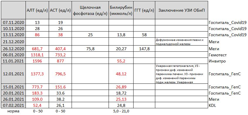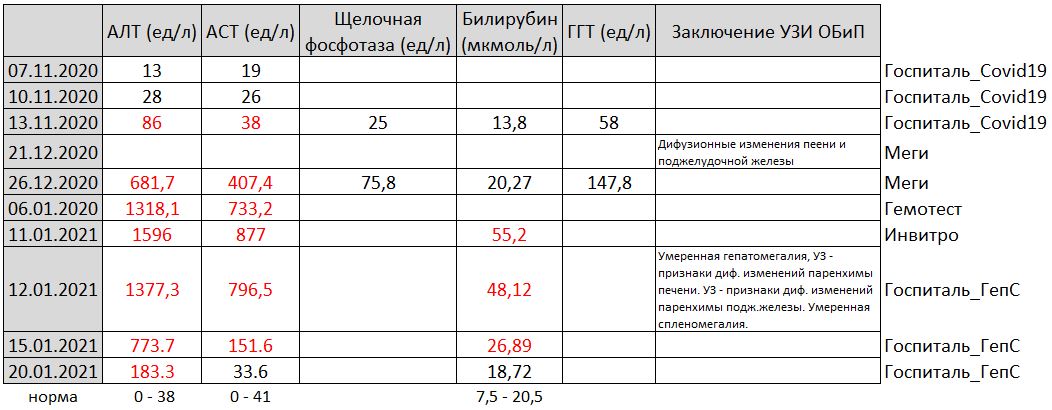 Я нашел ошибку в представленных ранее анализах, а именно, вместо даты 03.01.2020 должна быть 03.01.2021. Еще забыл указать анализы датируемые 30.12.2020 (гепС, гепВ).