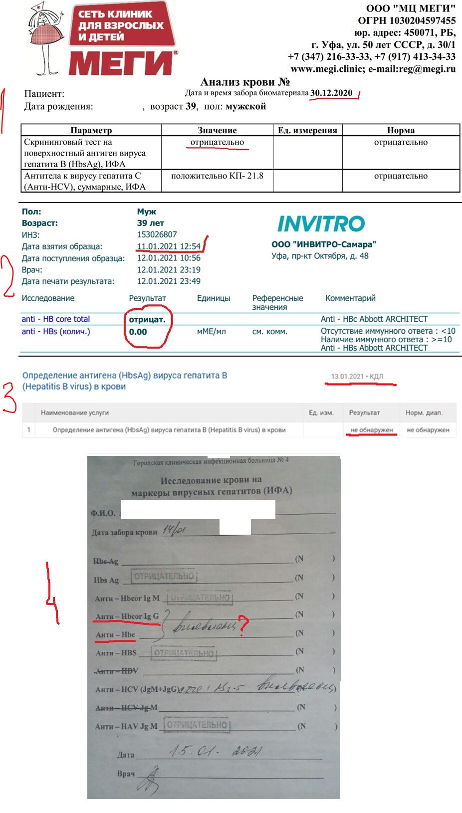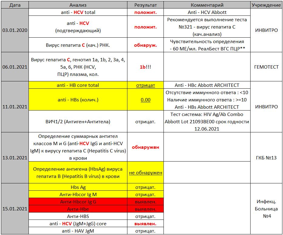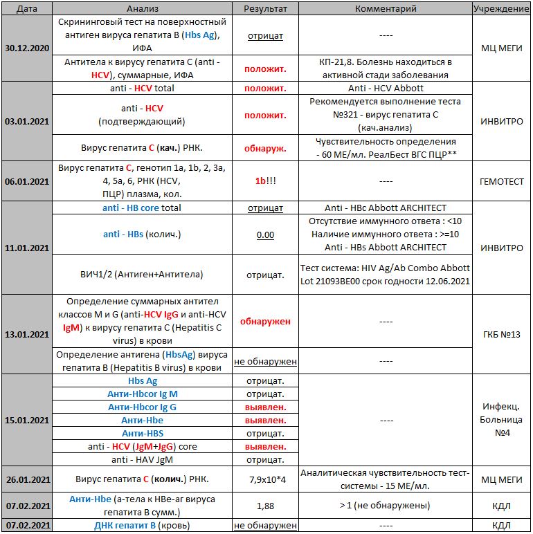 1. 31.01.2021 сдаю анализы anti-HBcorе total и ПЦР РНК гепатита C колич. + АЛТ, АСТ, билирубин.