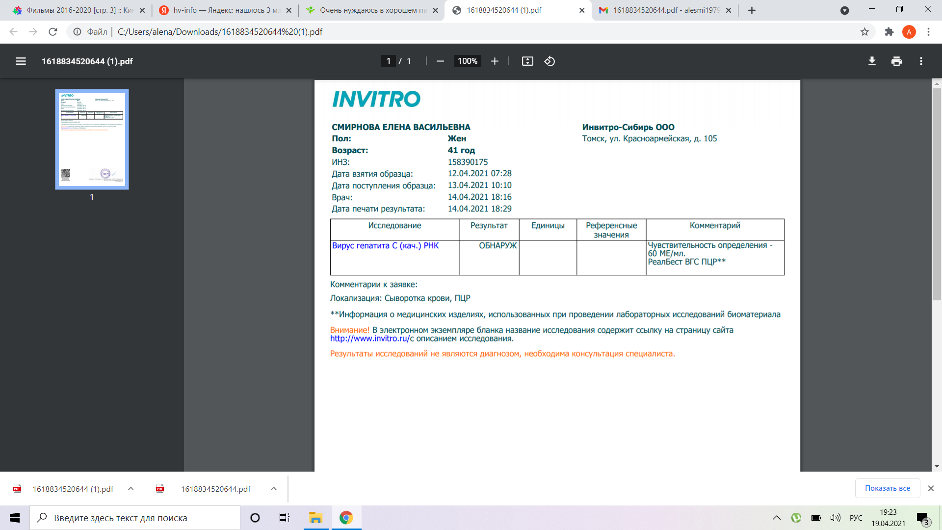 Закончила терапию ещё в мае, но муж уехал в командировку и просто не было возможности дойти сделать ПЦРку. Но вот спустя 6 недель после окончания лечения ПЦР -. Ура!!! Всем спасибо за поддержку и помощь