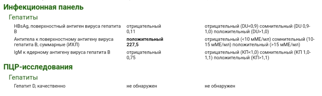anti-HBcore отрицательно, anti-HBs положительно