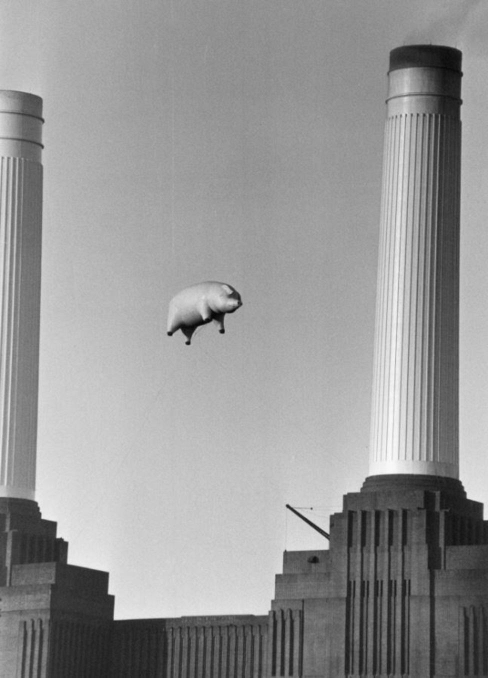 "Звездный час для электростанции наступил 2 декабря 1976 года, когда группа фотографов и кинорепортеров собралась у огромного здания для того, чтобы заснять в полете громадную надувную розовую свинью, наполненную гелием. Свинья была изготовлена по спецзаказу в Германии на заводе, где делают дирижабли. На всякий случай был предусмотрен даже снайпер, вооруженный винтовкой с разрывными патронами. Он должен был продырявить свинью, если ее полет стал бы отклоняться от намеченного. В объявленный день доставленного гелия оказалось недостаточно, свинья в воздух не взлетала и решено было собраться назавтра. На следующее утро, третьего декабря, пришли все — кроме снайпера. Двенадцатиметровую свинью надули гелием, фотографы защелкали затворами, зажужжали кинокамеры, но тут, к всеобщему изумлению, веревка удерживавшая свинью, оборвалась и огромная хрюшка начала плавно взмывать в небеса. Первым о полете розовой свиньи доложил пилот реактивного самолета, приземлившегося в лондонском аэропорту Хитроу. Пилота тут же отправили дышать в трубку Раппорта, но, убедившись в том, что он трезв, приняли информацию к сведению. В погоню был послан полицейский вертолет, который обнаружил летающую свинью, следовал за ней некоторое время, а потом возвратился на базу. Розовое парнокопытное парило над Лондоном, взмывая все выше и выше. За ее полетом теперь следили локаторы Гражданской Авиации: на высоте 6 тысяч метров свинья плыла в сторону Германии. "Соскучилась, видно, по дому!" — сострил один из наблюдателей. В конце концов, воздухоплавающее животное приземлилось на юго-востоке Англии, в графстве Кент. Вся эта операция была задумана ради фотографии на обложке следующего альбома Pink Floyd под названием Animals."