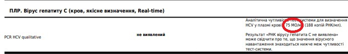 "Аналітична чутливість тест-системи для визначення HCV у плазмі крові – 75 МО/мл (188 копій РНК/мл).