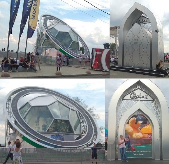 Памятная скульптура к ЧМ 2022 "Встретимся в Катаре". С обратной ее стороны экран, на котором онлайн из столицы Катара Доха.