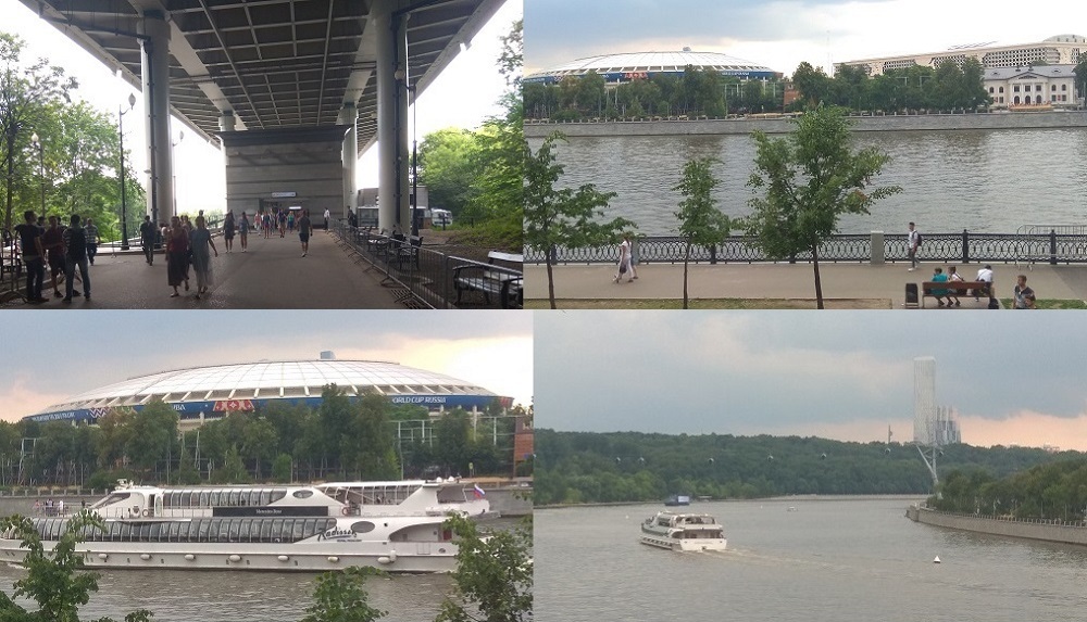 Перед тем, как войти, поднимаемся на мост к верхнему воду и любуемся видами на стадион Лужники, на Москву-реку.