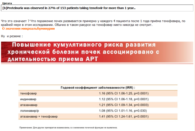 janmars писал(а):По статистике , каждый четвёртый пациент получающий Тенофовир получает через год приёма тяжелое хроническое заболевание почек . Я говорю за доступный Тенофовир . Но сейчас новый вышел в Америке , который у нас испытывали .