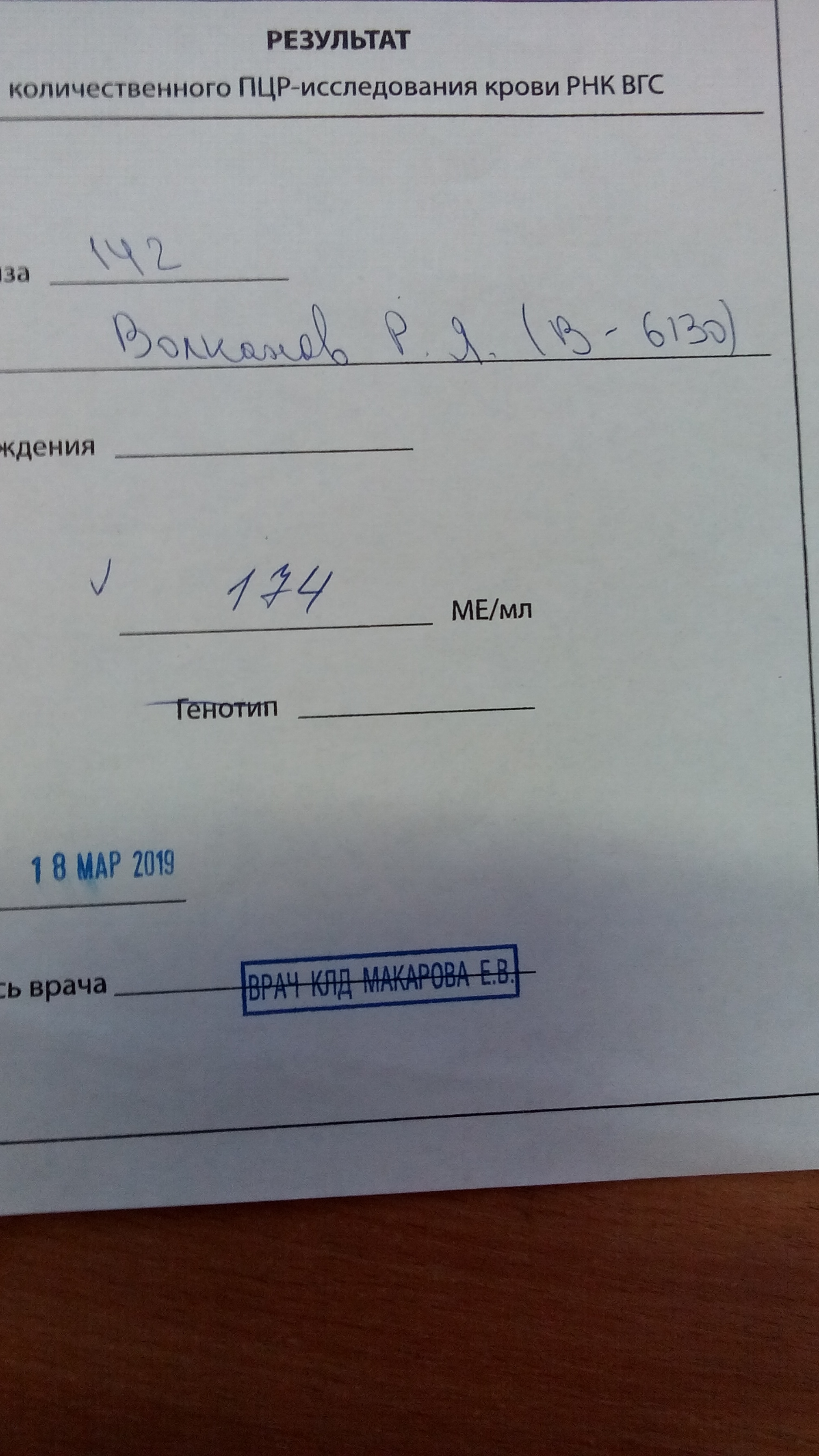 HCV 1b, обнаружен в июне 2018, F0 (5.1 кПа)