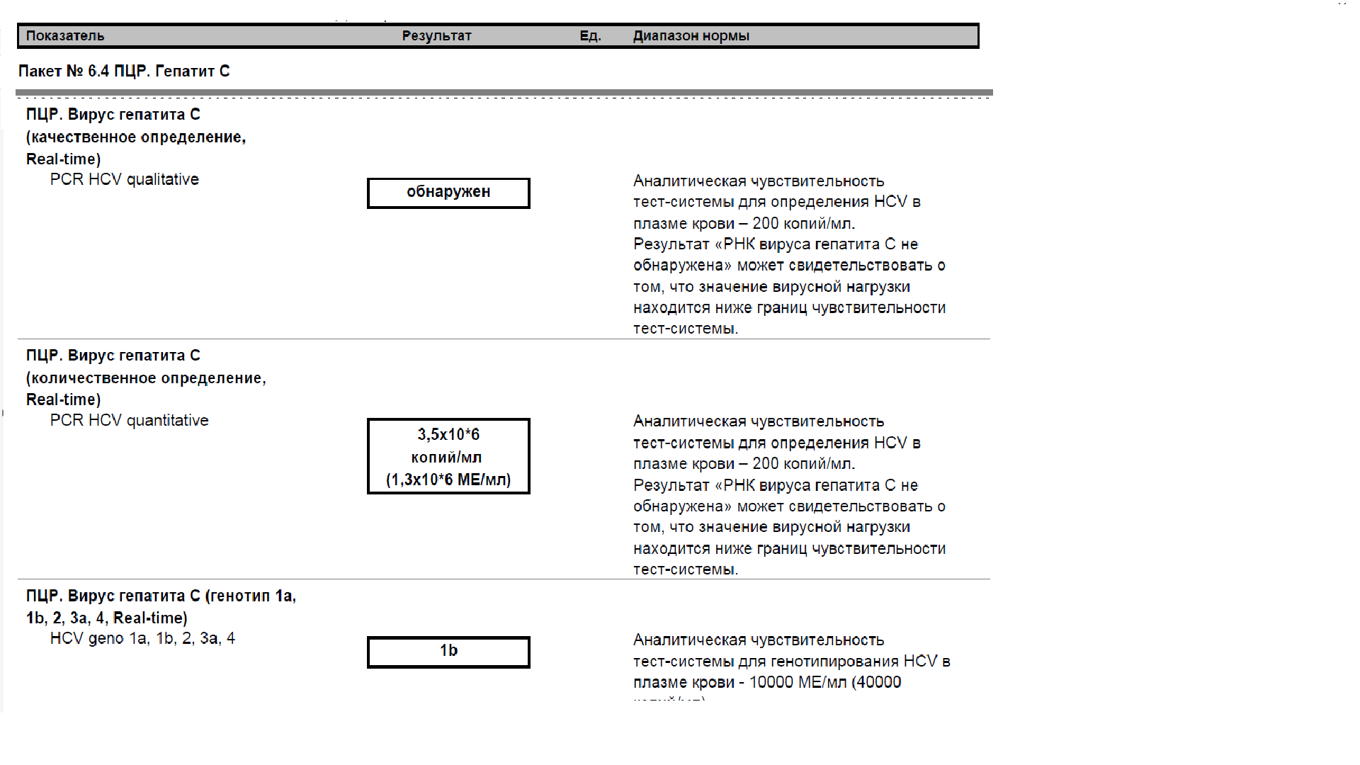 Линейный диапазон теста 15 – 100000000 МЕ/мл. Анализируются генотипы 1- 6 (1, 2, 3, 4, 5, 6). Чувствительность теста составляет 15 МЕ/мл.