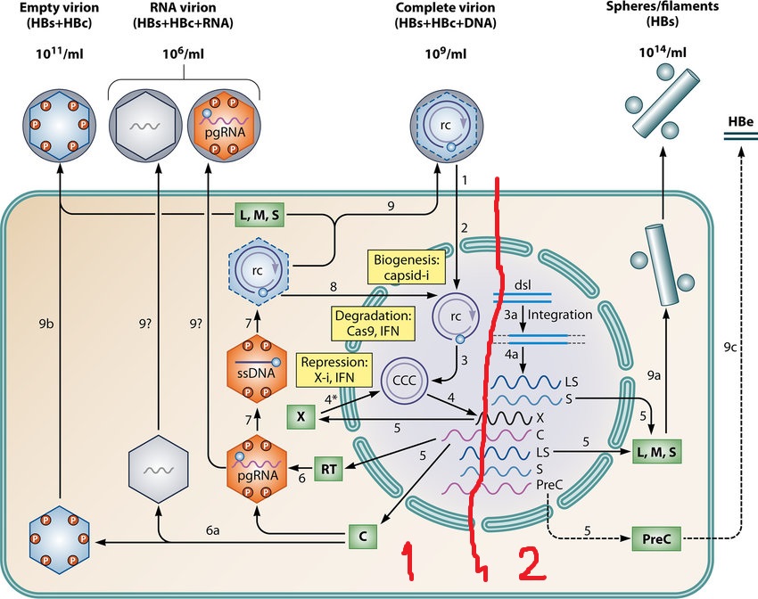 1. rcDNA - преобразование расслабленной rcДНК в кзк ДНК(после внедрения HBsAg в клетку, высвобождается цепь ДНК rcDNA которая превращается в кзкДНК ), после чего он транскрибируется (перенос генетической информации с ДНК на РНК) с образованием прегомной РНК (неправильной) которая соберет ДНК с нуклеотидами вируса, которые при активации клетки будут воспроизводить себе подобных. Только непонятно что за X, RT, C - это варианты дальнейшего развития при переносе ДНК с помощью РНК? Может кто прояснит?
