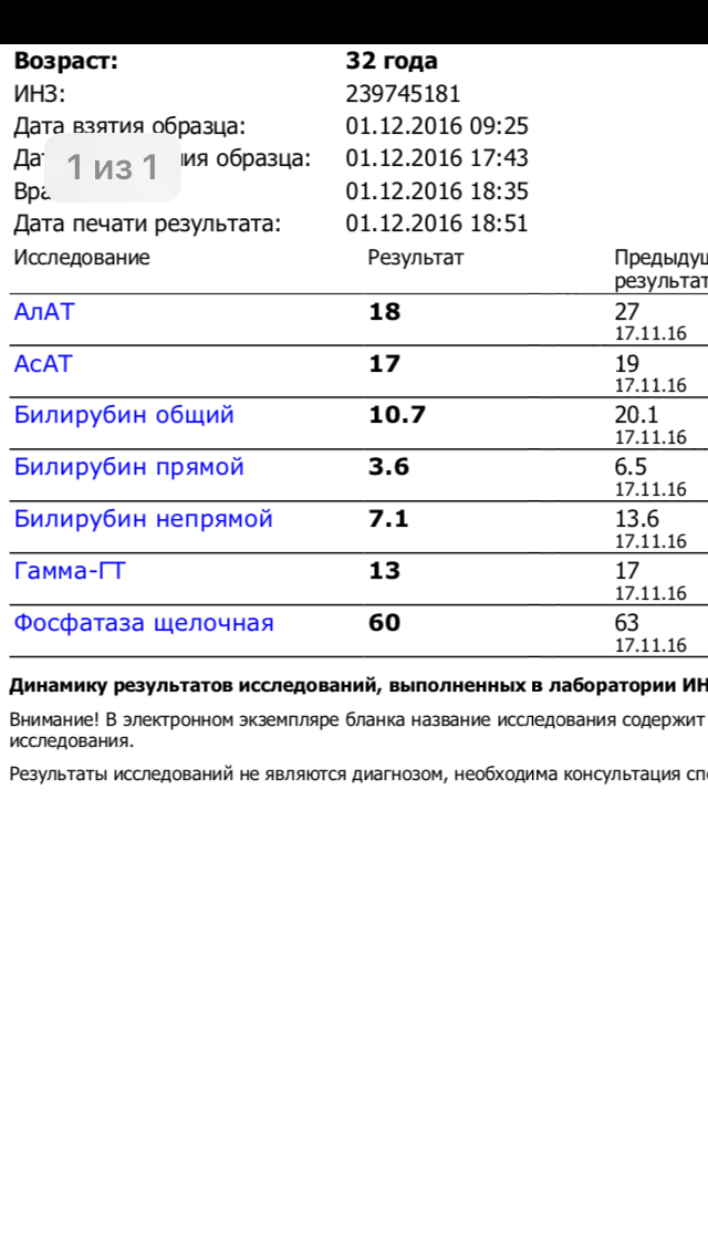 Результат-По билирубину вообще всё супер, в 2 раза падение.