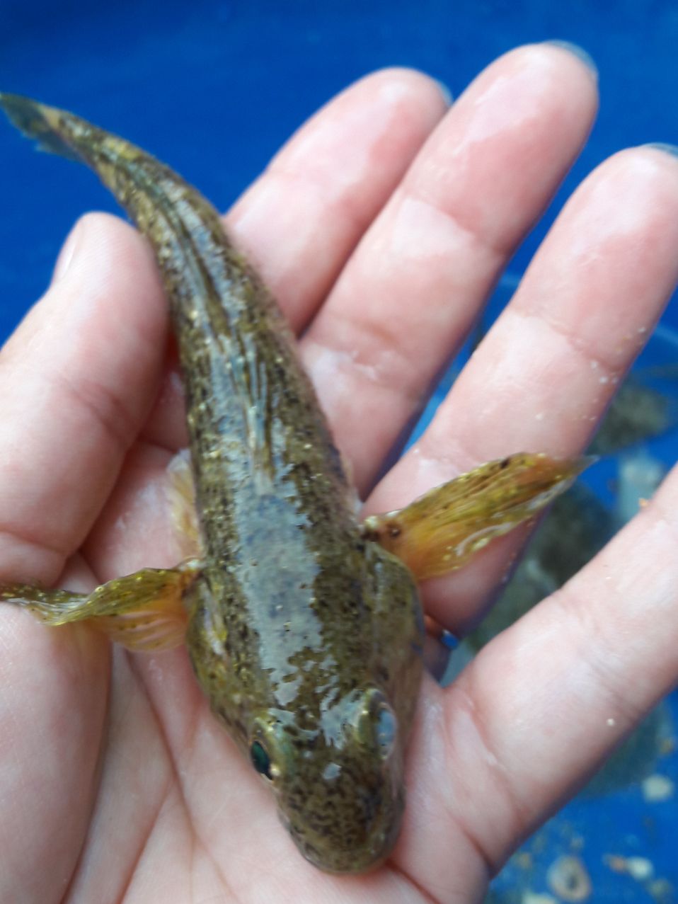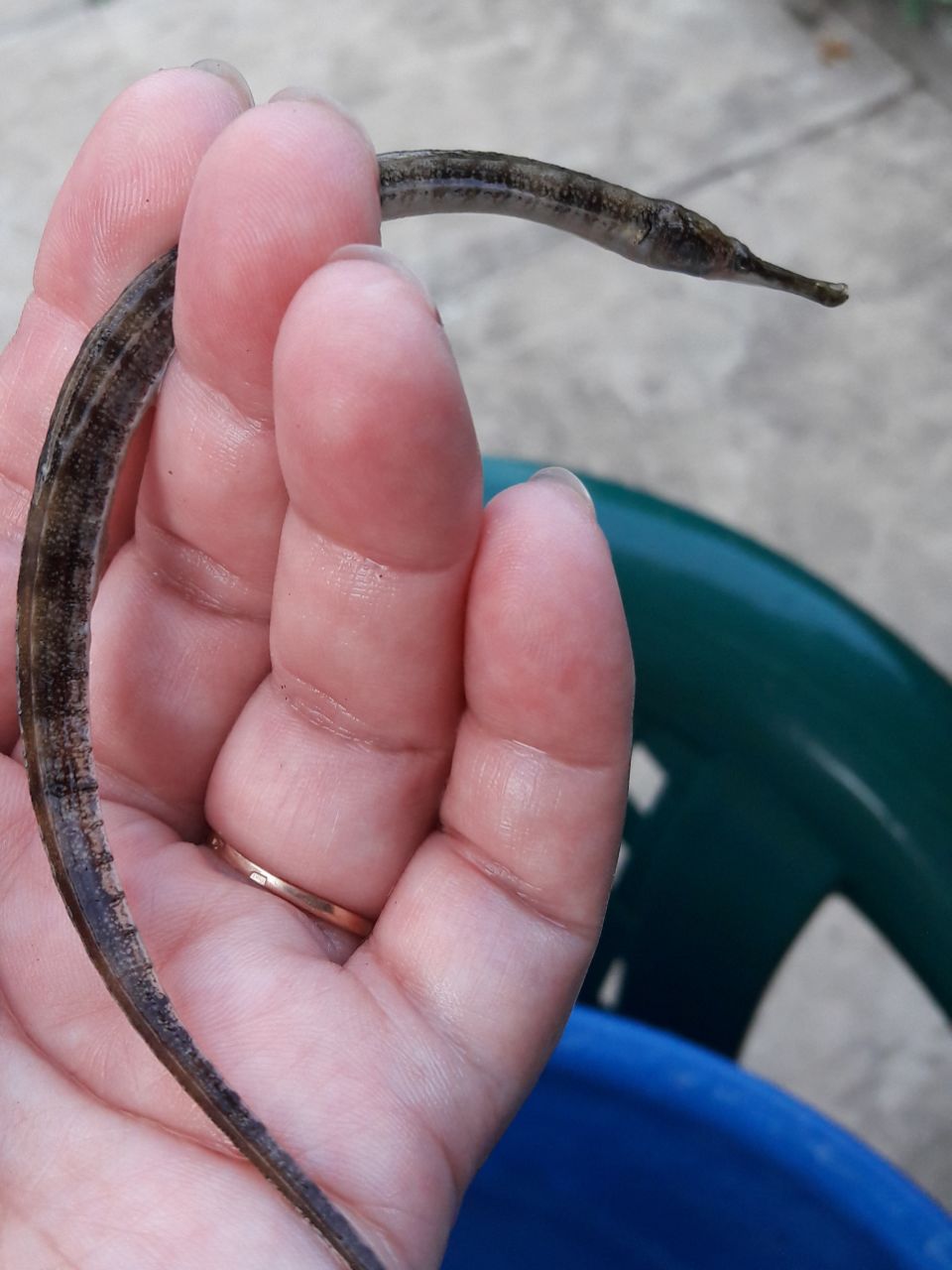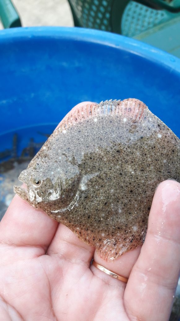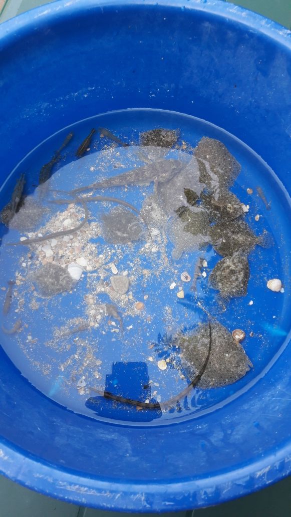 Руками несколько штучек поймала для местной кошки. В море зашла, рыба из-под ног выскальзывает, кроме камбалы. Та так и остаётся под ногами.