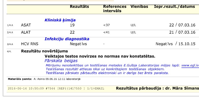 HBeAg - ; anti-HBe + ; anti-HDV total - ; anti-HCV total -
