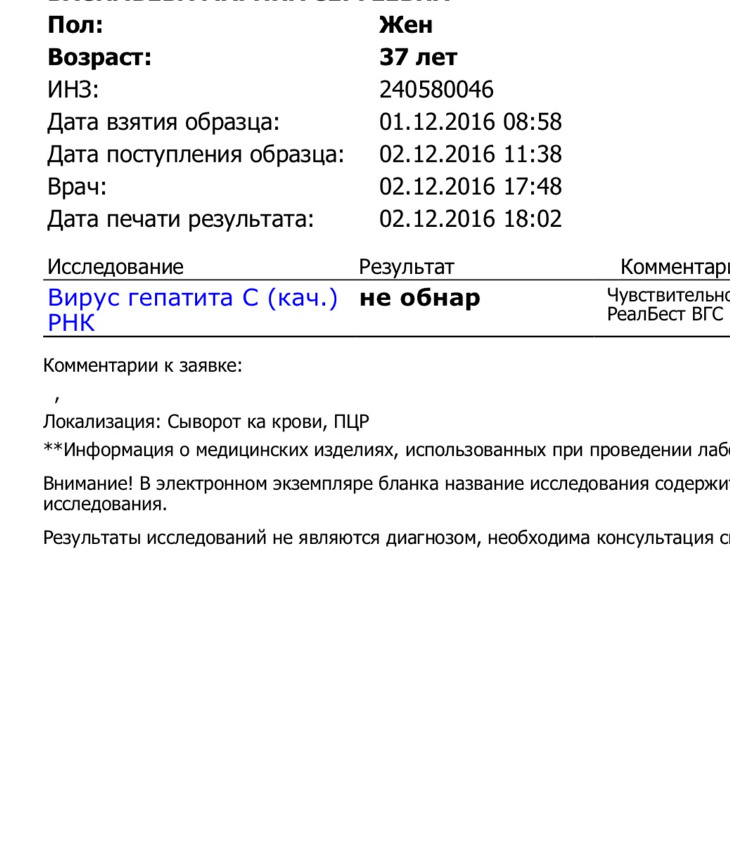 4н: АЛТ 26, АСТ 19, ГГТ26, билирубин 16, сахар 5,6, Холестирин 6,1 ПЦР КАЧ 60 МЕ (-) инвитро