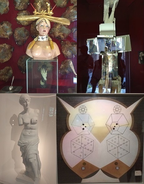 Вокруг медали анаграмма из букв имени Сальватор Дали, составленная его бывшим другом Андре Бретоном и отражающая, по его мнению, его сущность - AVIDA DOLLARS (жажда долларов). 12. Далее проходим в зал литографий. В первой из витрин зала представлен монтаж с Венерой Милосской и классической скульптурой, стоящими по бокам созданного художником стула с ложками, увенчанного антропоморфной скрипкой.