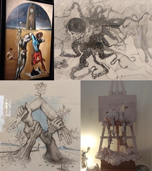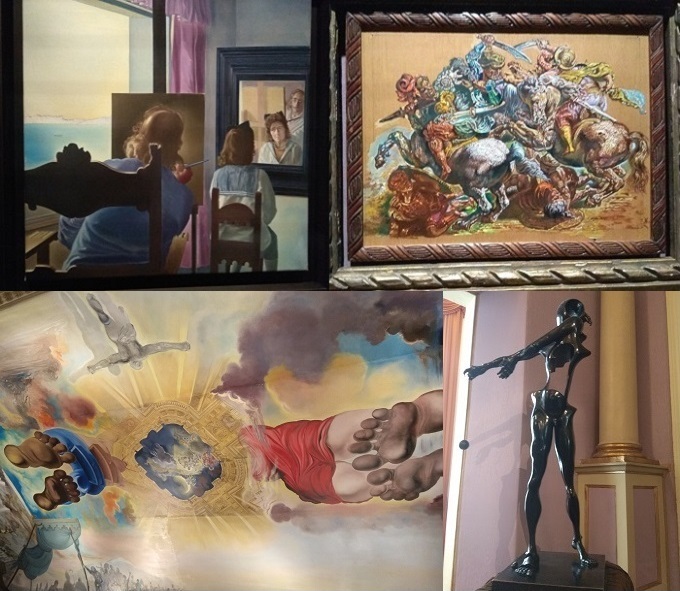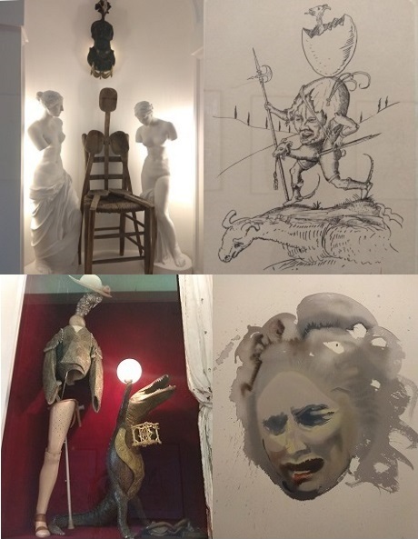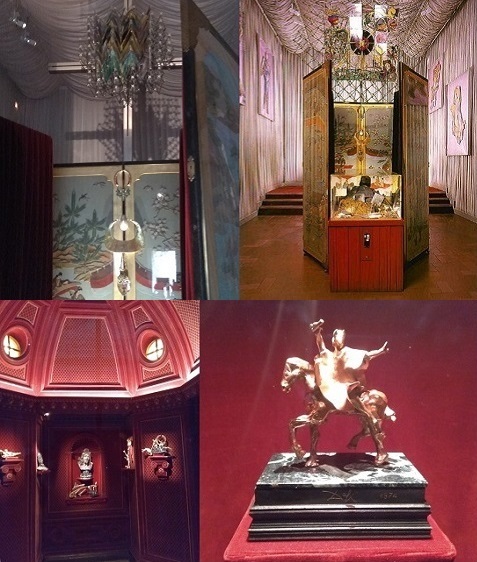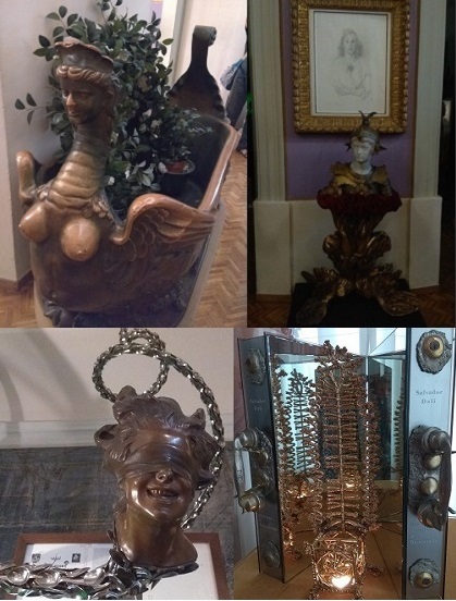 "Барселонский манекен" - модернистская картина с тройным силуэтом, окруженным тенями, описывающими его в разных планах. Манекен составлен из различных геометрических форм и таких символических элементов, как глаз, полумесяц, рыба с ее сексуальной символикой-подвязкой. 11. В этом же крыле зал "Дали д'Ор", в котором представлена серия инкрустированных в ювелирные изделия нумерованных медалей с изображением обоих супругов Дали и Гала.