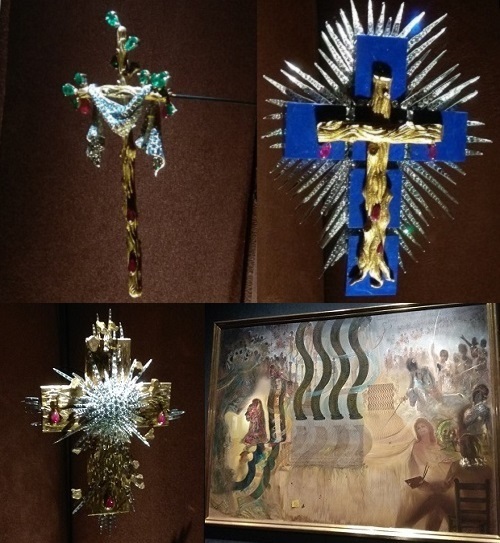 Слегка обалдевшие от такого обилия сюра, мы вывалились на улицу, чтоб перевести дух. Нас еще ждал зал "Дали. Ювелирные работы", у которого отдельный вход с улицы. Это совсем небольшой зал, вдоль стен которого стоят стеклянные витрины с украшениями и эскизами к ним. В зале кромешная темнота, экспонаты подсвечены, но стекло витрин бликует, людей много, небольшая толчея даже. Так что на хорошие снимки рассчитывать не приходилось - несколько нормальных фото и не более того. Сорри.