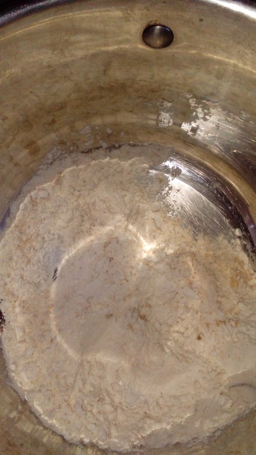 Ставим на маленький огонь и не прерывно помешивая доводим нашу муку до чуть золотистого цвета.пересыпаем в кострюлю в которой будем готовить соус