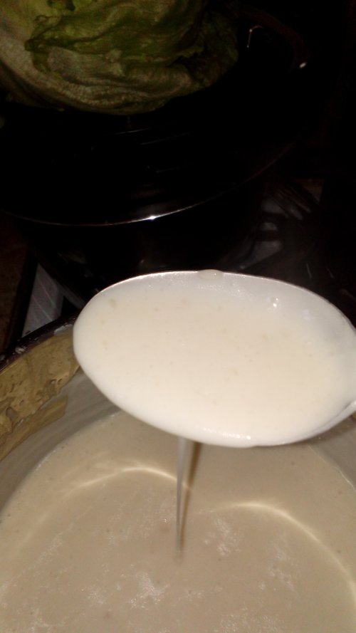 Тонкой струйкой вливаем в нашу муку бульон при не прирывном помешивании венчиком.ставим на средний огонь и не прекращая мешать доводим до кипения. Убавляем огонь до минимума и провариваем 2-3 мин что б загустел.консистенция густой сметаны