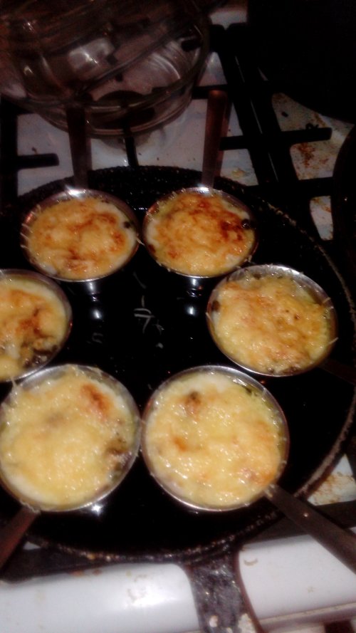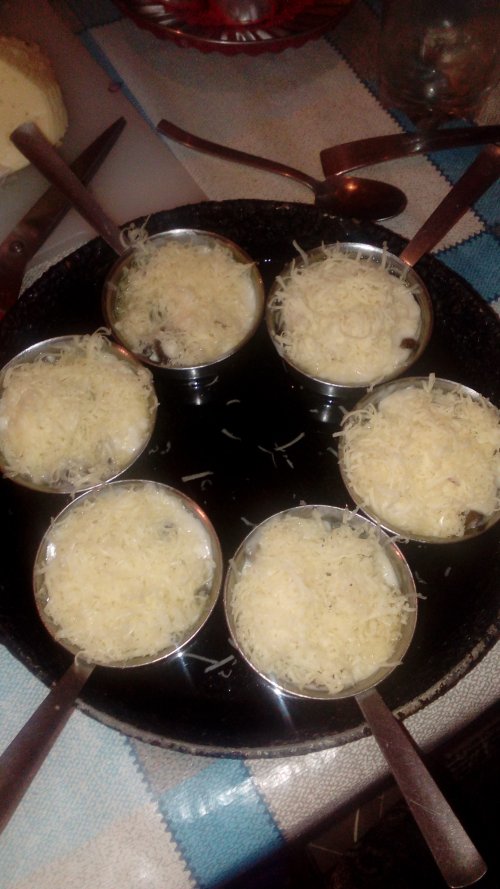 Теперь обжариваем грибы с луком ну или без того раскладываем грибы в какотницы сверху соус перемешиваем и присыпаем тертым сыром ставим какотницы в сковороду с небольшим ко-вом воды и в духовку пока сыр не станет золотистым. В место грибов можно курицу.ПРИЯТНОГО АППЕТИТА!!!!