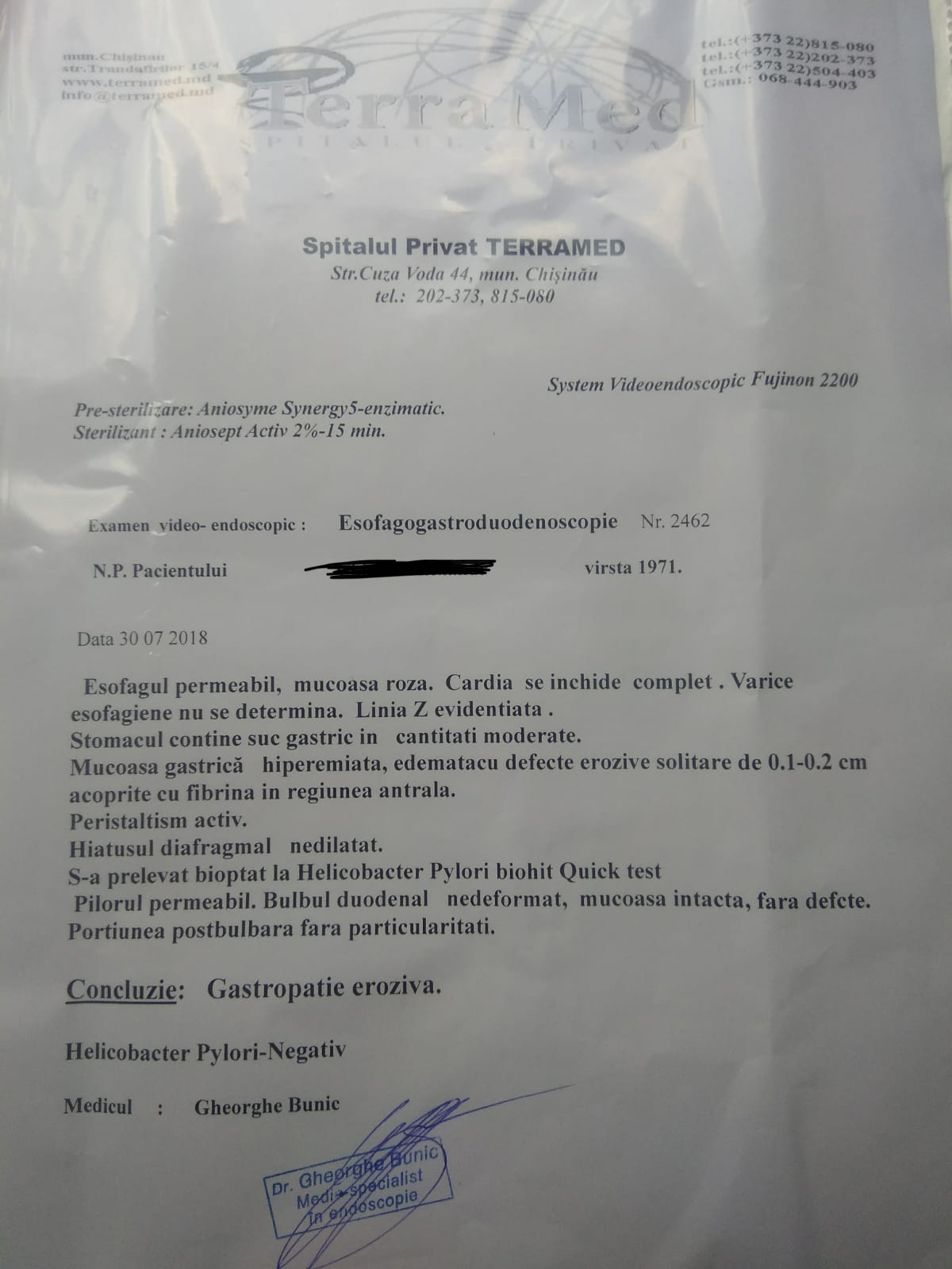 Ребята мы съездили прошли обследование , фгдс на руках , фиброскан на руках, генотип будет через 2 недели , но проблема в том что все как подсказал ранее Стив на румынском языке , кто может подскажите что по результатам ? Я одно поняла что фиброз F2, если конечно правильно поняла .щас попробую перевести на переводчике что получится тоже скину сюда .И на будущее если кому пригодится ( конечно желаю чтоб вам это не пригодилось не когда в жизни будьте здоровы не болейте ) фгдс прошли как и планировали в terrameg -520 +150 хилакобактери , далее планировали пройти фиброскан в меддиагностик (850лей)и в инвитро генотип (1350) но получилось что поехали узнать в республиканский диагностический центр насчёт генотипа и там прошли генотип и фиброскан всего за 700 лей , так что получилось хорошая экономия .